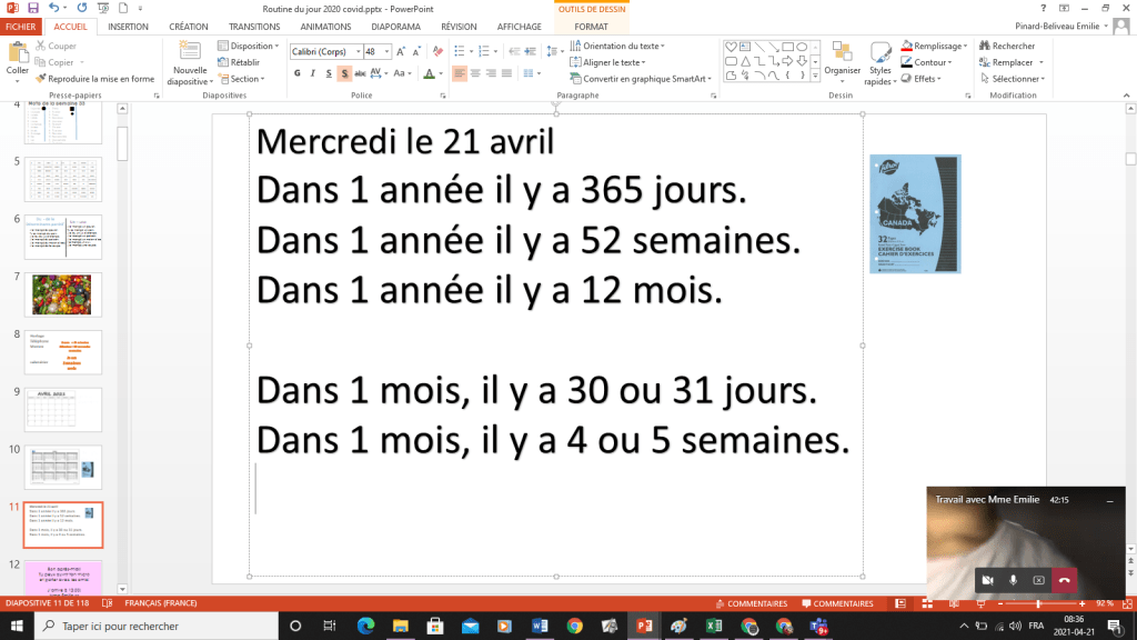 8:00 à 8:30 — Travail avec Mme Emilie